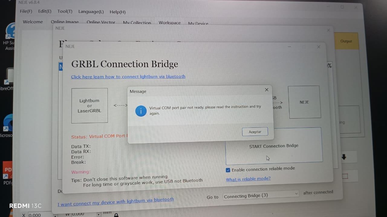 How can I fix this connection problem? I want to connect with Lightburn and I keep getting this message. Could someone please help me?