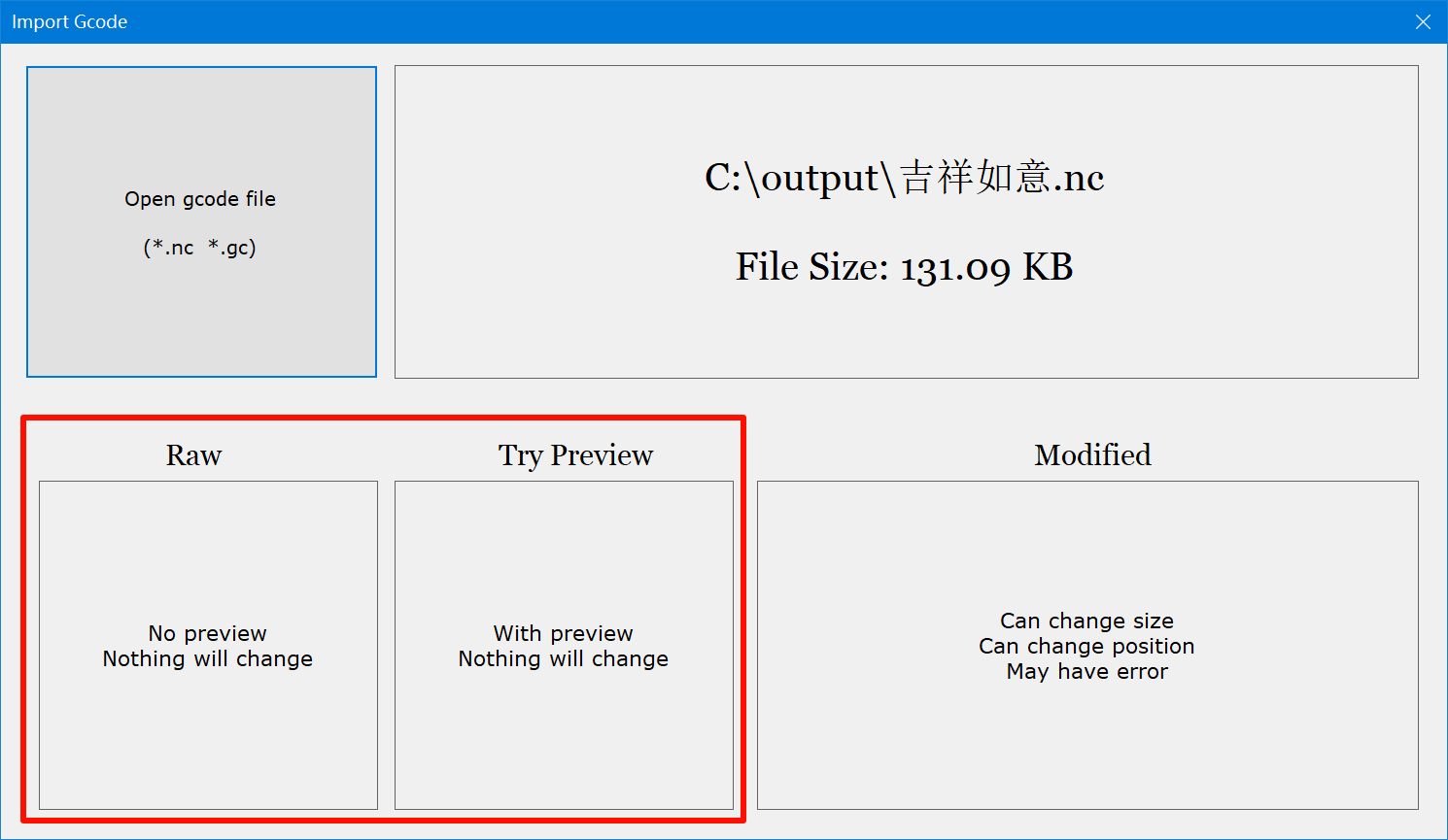 I have finished parsing and previewing gcode, please download the latest version of the control software v6.8.1