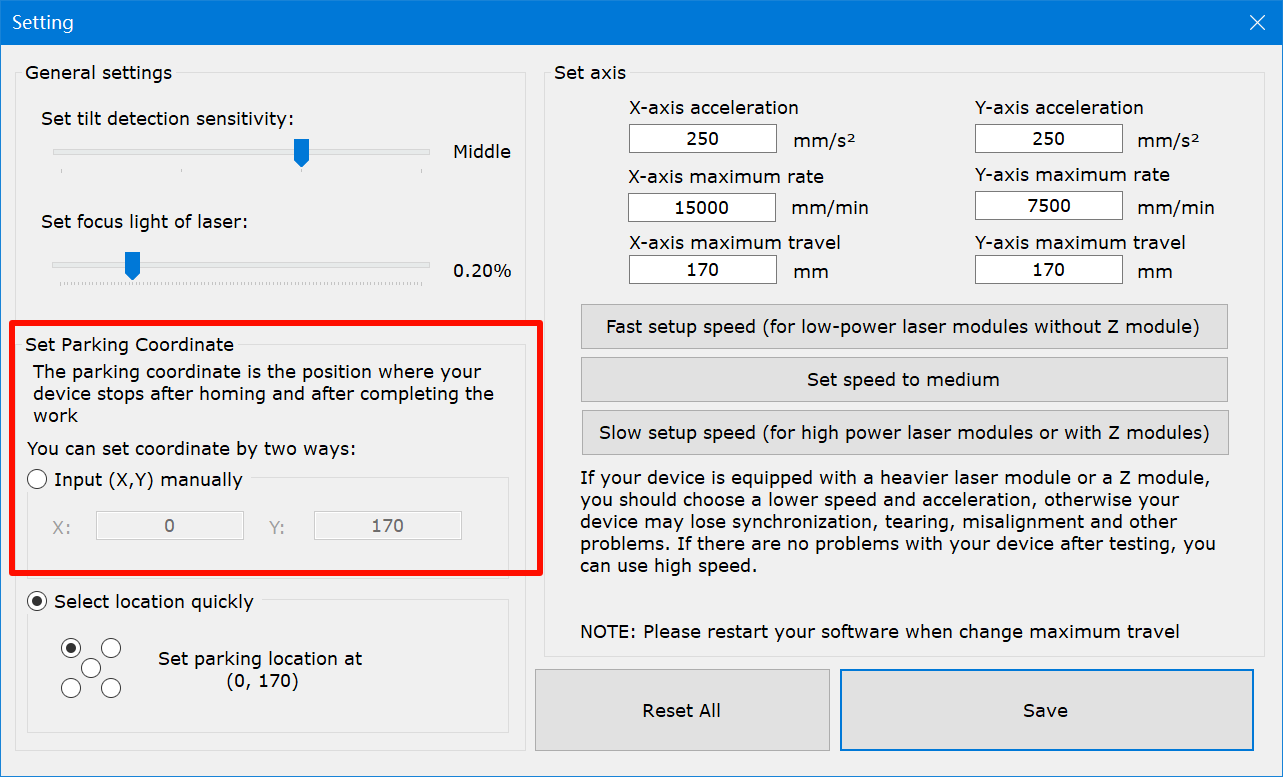 When selected parking location is top right or bottom right or bottom left (anything but top left) and X-axis and Y-axis maximums are>150mm (model default upper limit is 170mm) -
